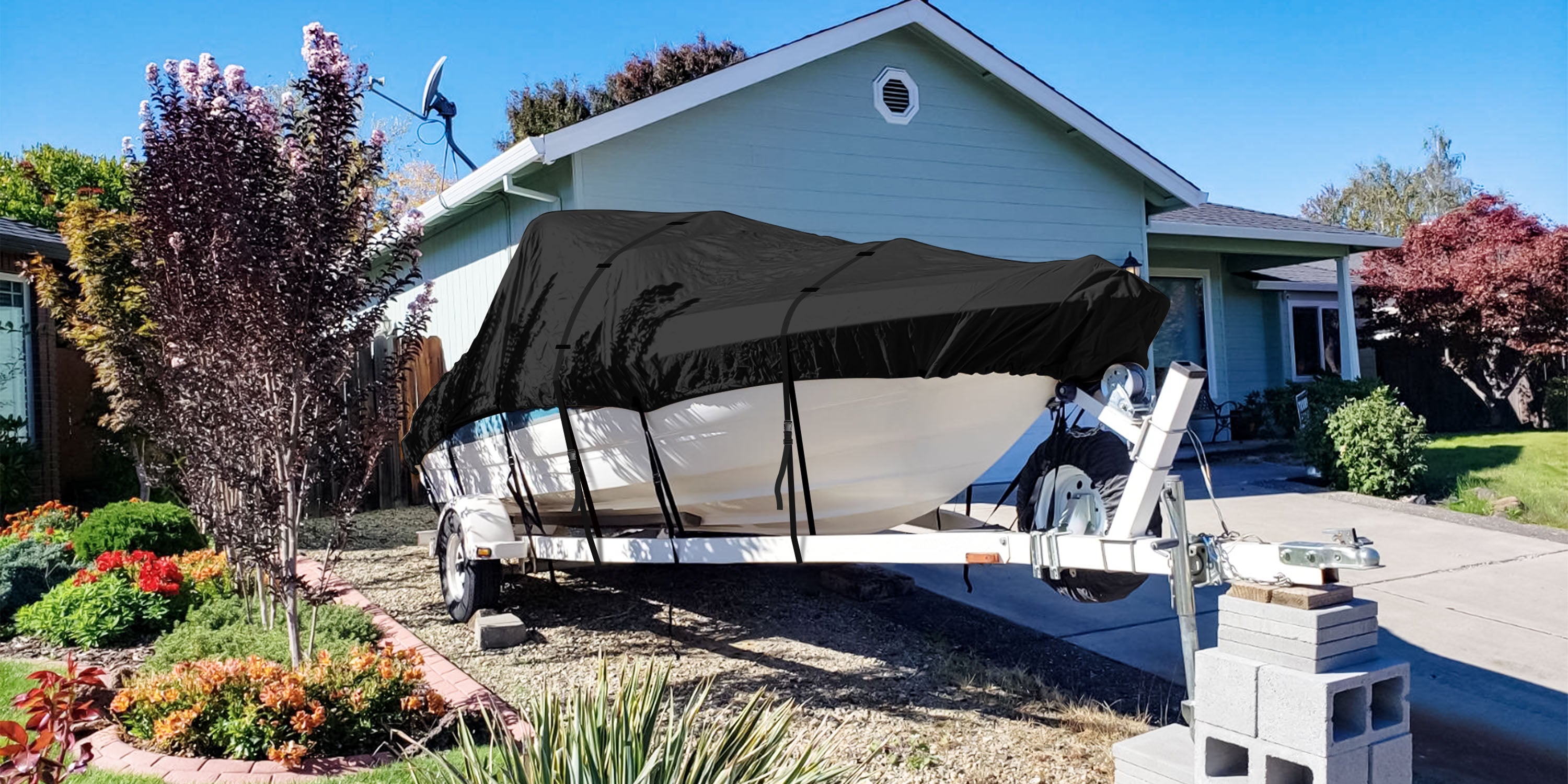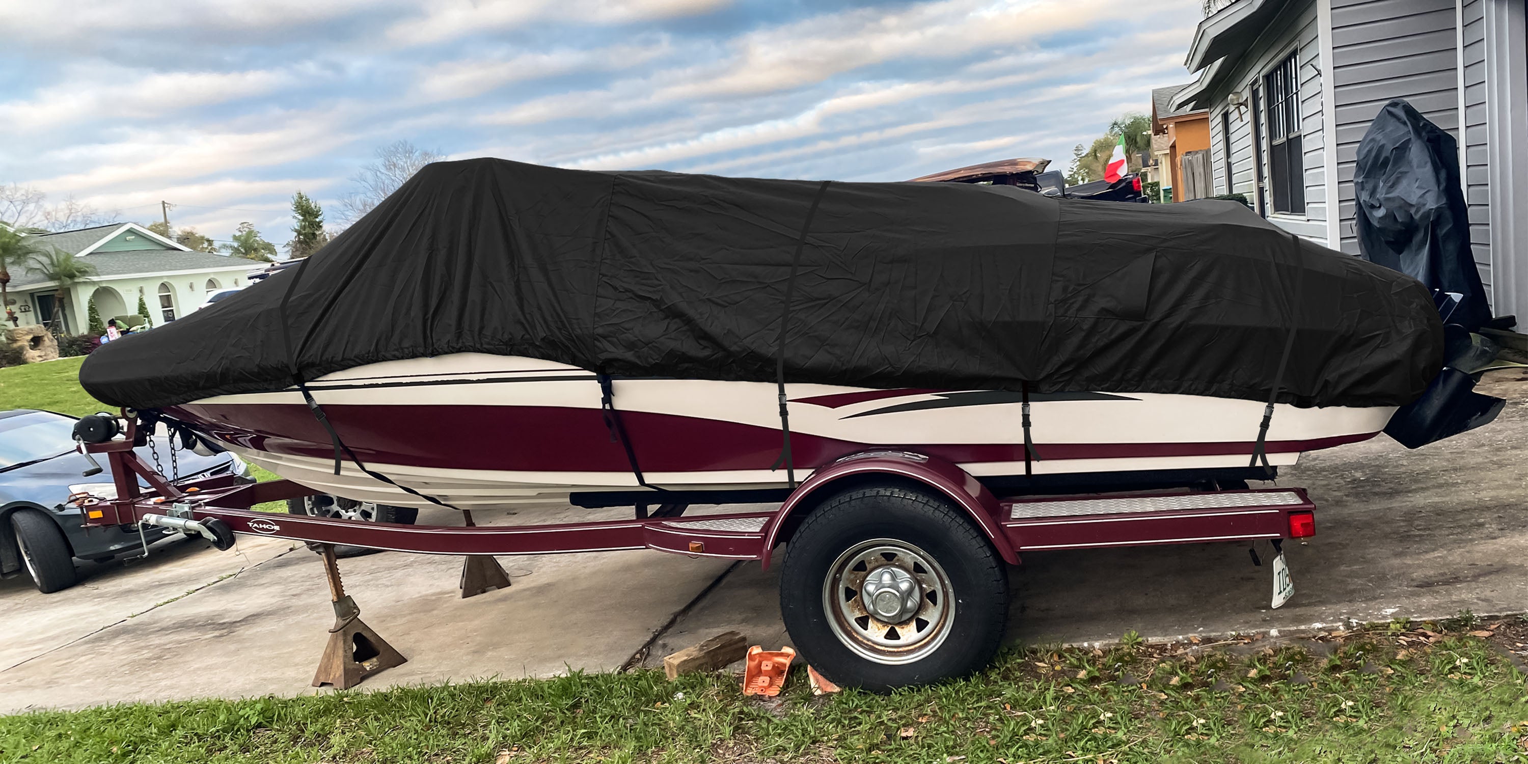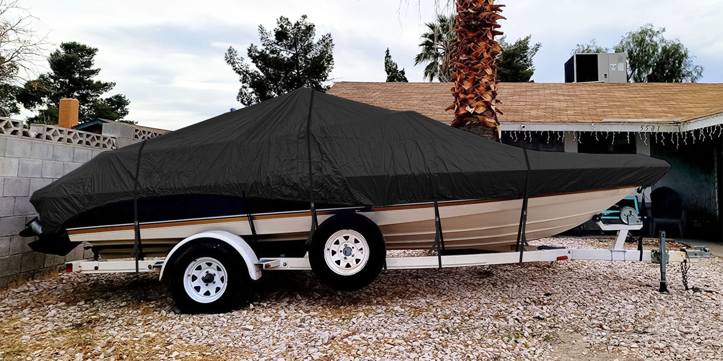 Kipiea 600D Trailerable Boat Cover - Fits V-Hull, Tri-Hull, Runabout Boat - UV Resistant, Waterproof Boat Cover with Storage Bag, Reinforced Windproof Side Straps